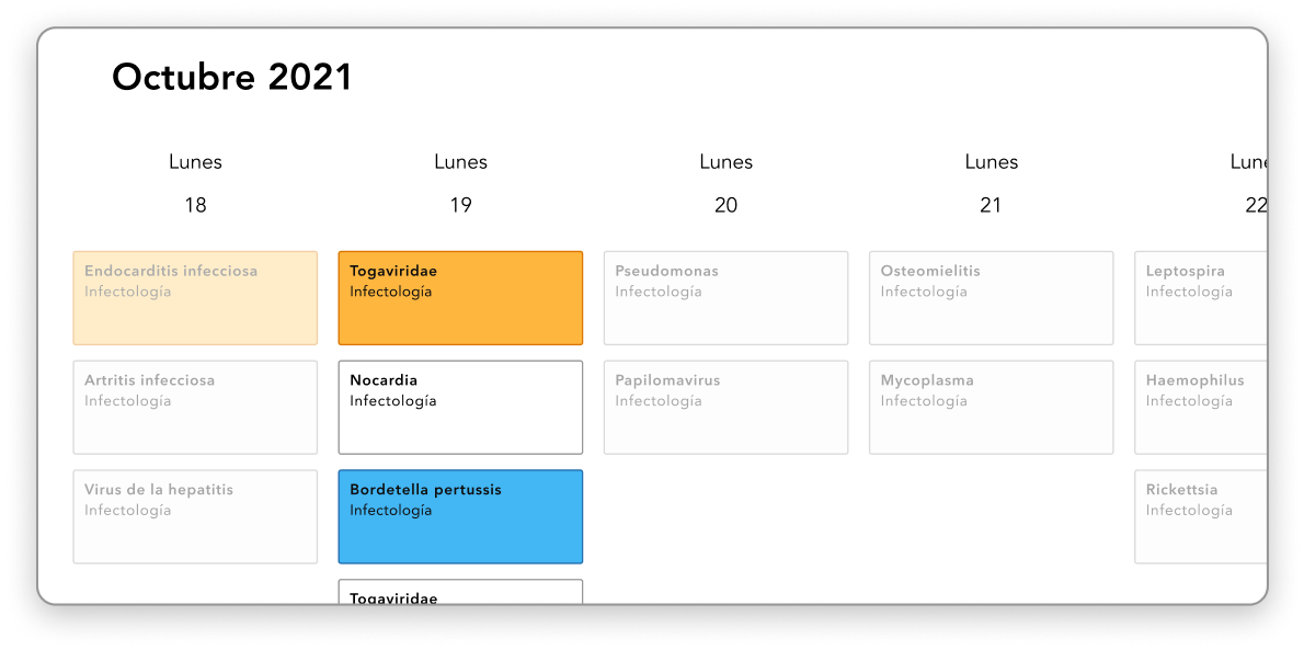 Nos encargamos de tu organización de estudio, todos los días. MedCoach asignará automáticamente los temas para cada día y así evitar la sobrecarga de estudio. También puedes escoger tus días de descanso y adelantar o reponer temas.